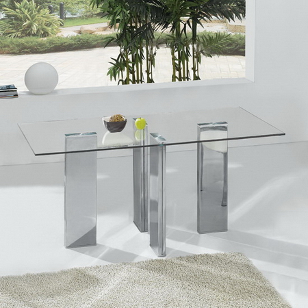 Features transparent glass and gleaming chrome to spectacular effect. This table is available in rectangular or round shape.